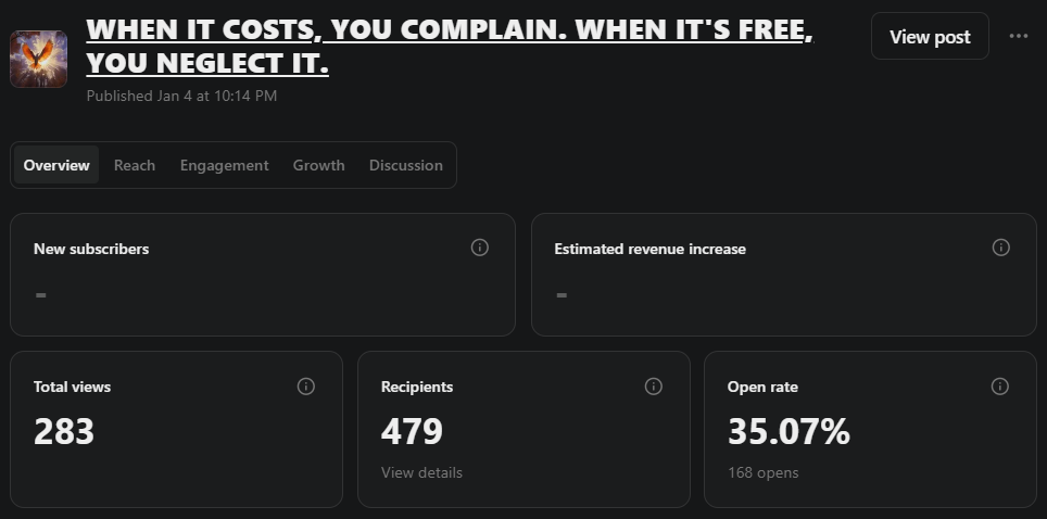 Here are the stats for the post I wrote where people were allowed in for free.